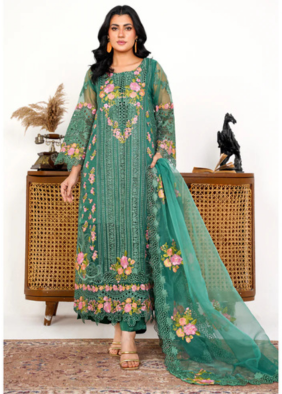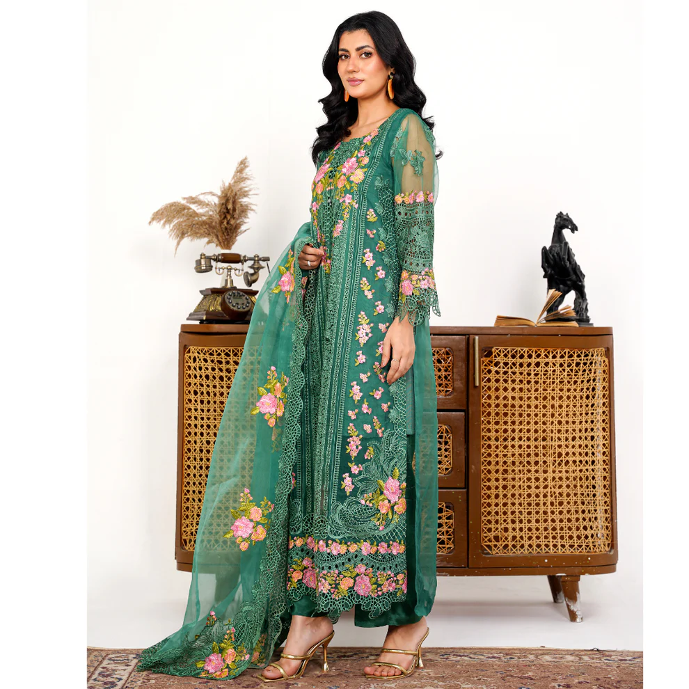 Radiate elegance in this jade green organza ensemble, adorned with intricate threadwork, kavia detailing, and pastel floral embroidery. Paired with an embroidered dupatta, it’s the perfect blend of tradition and modern grace for festive occasions.