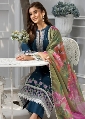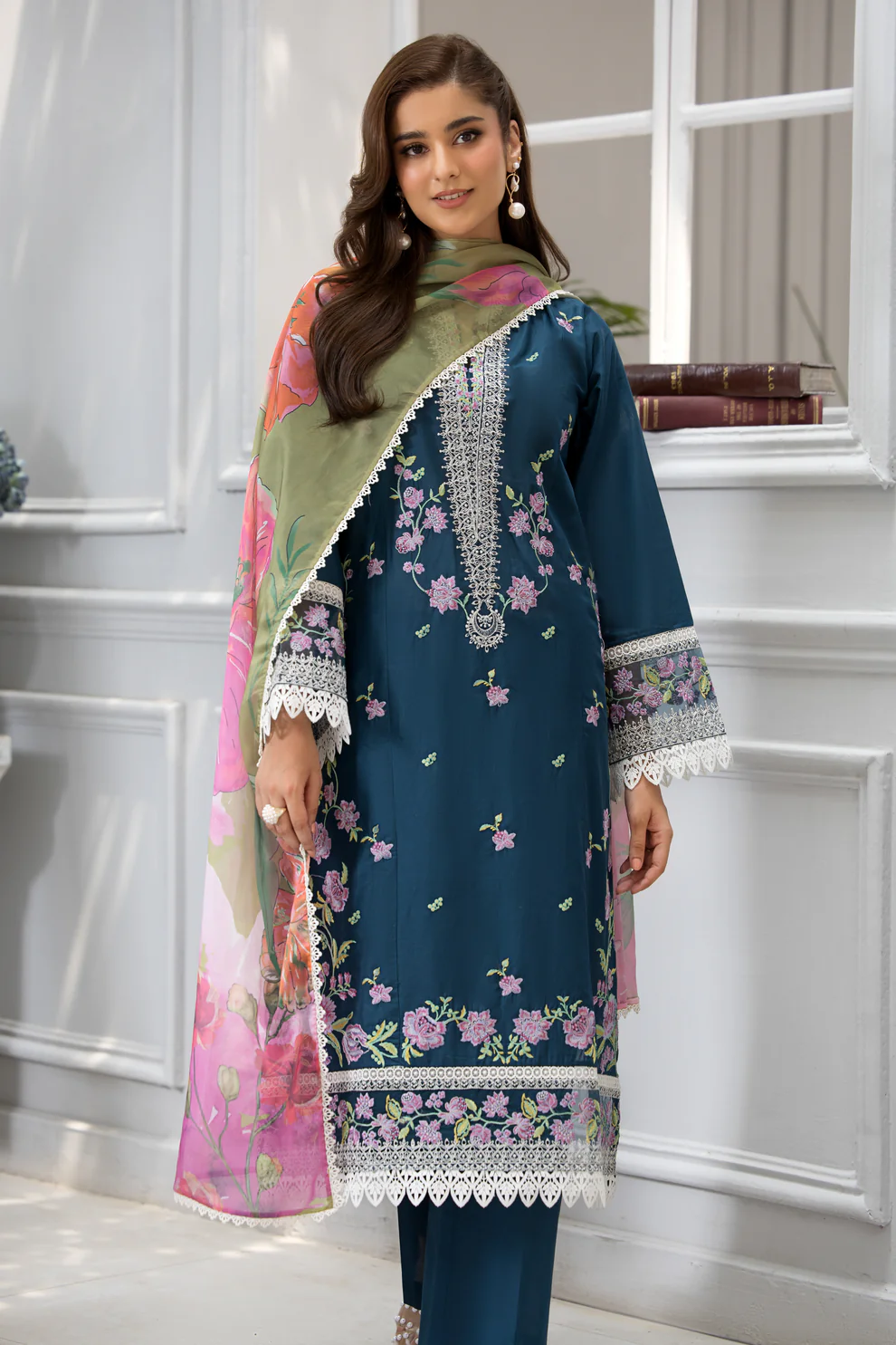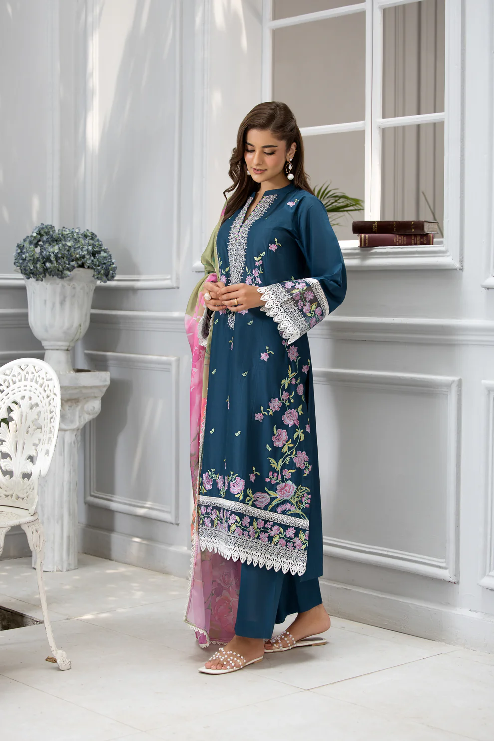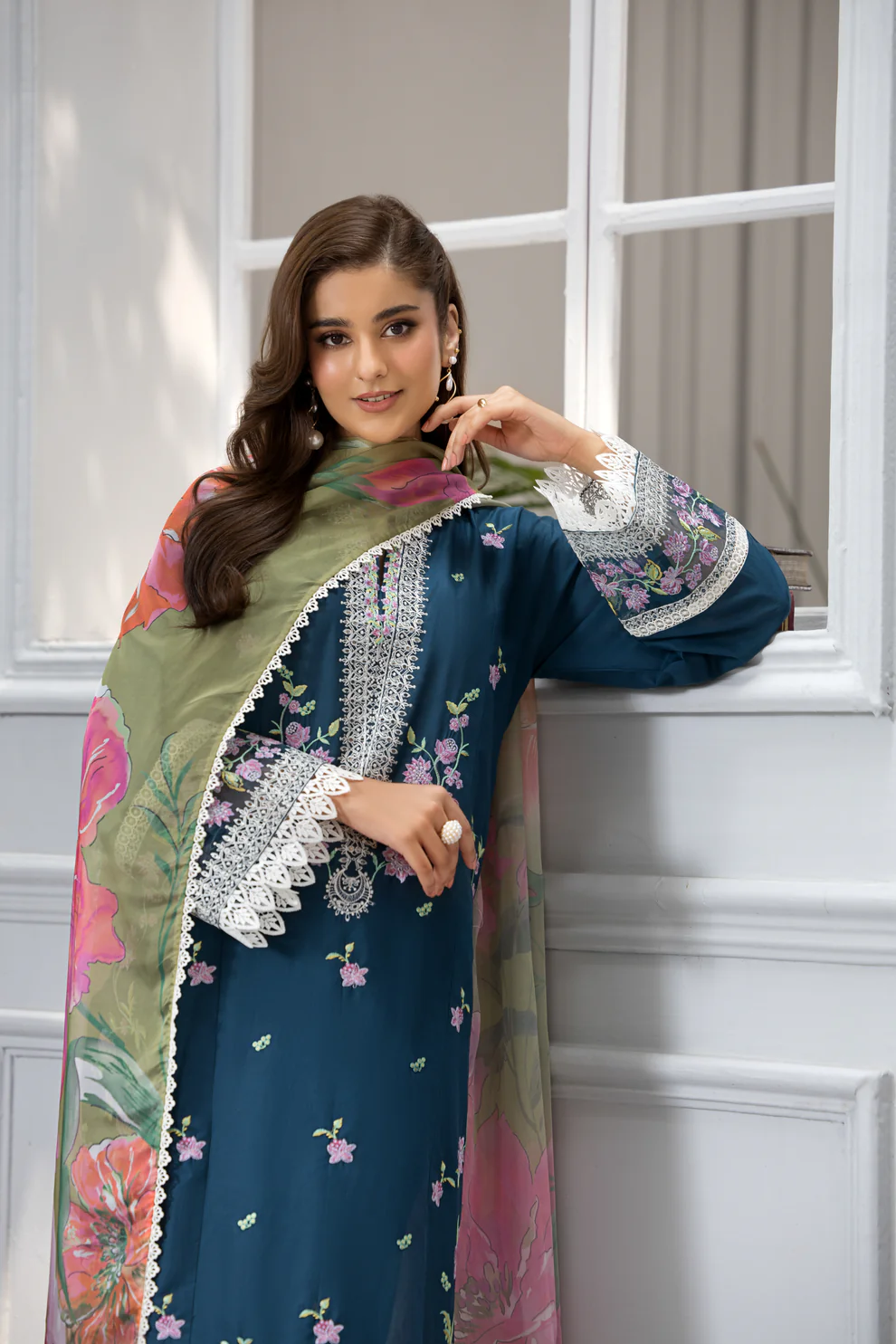 • Shirt: Teal-toned embroidered lawn shirt adorned with delicate floral patterns and intricate lace detailing on the sleeves and hem.