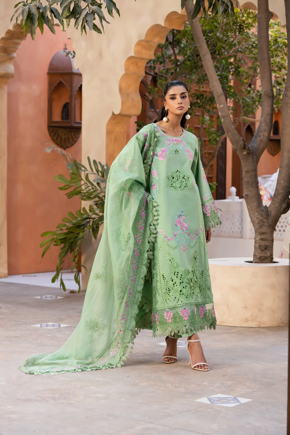 Drape yourself in the sophisticated charm of زمرد (Zamrud) – a stunning mint green ensemble adorned with delicate floral embroidery and intricate cutwork detailing. This ethereal outfit is designed for those who appreciate grace and elegance, making it a perfect choice for festive and formal occasions.